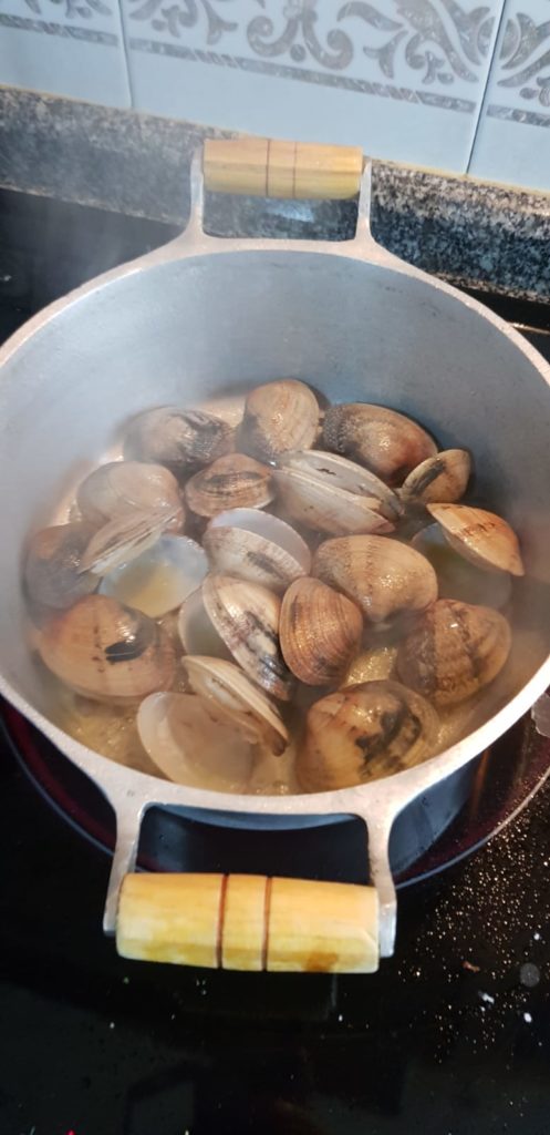 Ponemos a fuego medio/alto una sartén con una pizca de aceite de oliva e introducimos las almejas y tapamos. Movemos cada ratito las almejas para que no se peguen.